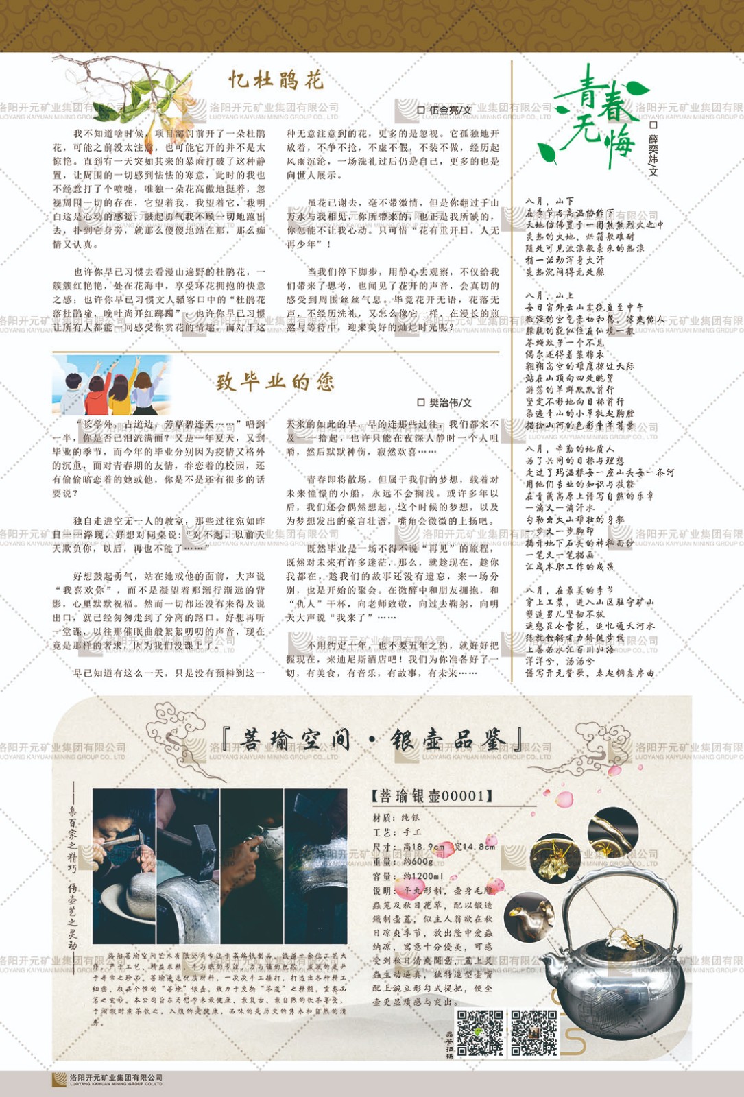 洛陽開元礦業(yè)集團有限公司簡介洛陽開元礦業(yè)集團有限公司,始成立于2006年,位于洛陽市開元大道269號。集團旗下共有五余家全資子公司,業(yè)務涉及有色金屬礦山開發(fā)、礦產(chǎn)品購銷與進出口貿(mào)易、房地產(chǎn)開發(fā)、文化藝術(shù)、企業(yè)管理與咨詢、資本投資等多個領域。民建河南省委委員、民建河南省委企業(yè)委副主任、民建洛陽市委委員、企業(yè)委主任、洛陽民建企業(yè)家協(xié)會會長許明月是公司創(chuàng)始人,現(xiàn)任洛陽開元礦業(yè)集團有限公司董事長。在礦業(yè)領域,洛陽開元礦業(yè)集團擁有多家實力雄厚的子公司:貴州開元礦業(yè)有限公司探、采礦權(quán)面積共11.33平方公里;興海縣銅鑫礦業(yè)有限公司探礦權(quán)面積8.76平方公里,礦山資源潛力巨大;2021年,開元集團與盧氏中科礦業(yè)有限公司開展戰(zhàn)略合作。盧氏中科礦業(yè)有限公司專注于有色金屬的浮選、加工和銷售,擁有強大的技術(shù)支撐平臺,是集探、采、選、冶、研為一體的中大型綜合礦業(yè)企業(yè)。目前,盧氏中科王家河1000噸選礦廠已成功投產(chǎn),雙河金礦、柳關(guān)欒盧鉛鋅礦相繼順利開工,樓房銀礦與圪老灣鉛鋅礦的深部探礦重大突破,標志著礦山版圖取得重大進展,為開元集團后續(xù)發(fā)展奠定了堅實基礎。在文化傳媒領域,洛陽市明月美術(shù)館通過豐富多樣的藝術(shù)展覽、學術(shù)研討和公共教育活動,努力打造一個集展覽、交流、教育、研究為一體的綜合性藝術(shù)平臺。此外,在金融投資領域,開元集團旗下的北京明峰資本管理有限公司專注于投資具有高增長潛力的優(yōu)秀企業(yè),特別是高科技、新能源、環(huán)保等新興產(chǎn)業(yè),為客戶提供個性化的資產(chǎn)配置服務。在做好企業(yè)經(jīng)營的同時,開元集團始終不忘企業(yè)的社會責任和家國情懷,以突出的愛心公益事跡,開展了一系列公益慈善活動:“民建林”公益事業(yè)通過“思源基金”“幫幫公益”線上公益平臺,與眾多愛心人士籌措資金20余萬元;資助541名貧困大學生共計270余萬元,推進“數(shù)字助力——河南AI人才培養(yǎng)”;捐款10萬元,馳援京津冀、黑龍江洪水地質(zhì)災害……公司于2017年底被洛陽市慈善總會評為“洛陽慈善風云榜——十大愛心集體”。洛陽開元礦業(yè)集團有限公司秉承持續(xù)發(fā)展理念,憑借多年來良好的企業(yè)信譽與經(jīng)營業(yè)績,與全國多家企業(yè)建立了良好合作關(guān)系,受到社會各界的一致好評,多次榮獲“納稅標兵”“先進企業(yè)”“招商引資模范企業(yè)”等榮譽稱號?;赝麃頃r路,開元人勠力同心,以“闖”的精神和“創(chuàng)”的勁頭,一路披荊斬棘,踏過千山萬水;展望新未來,開元人凝心聚力,不執(zhí)于“舊”,無畏于“新”,秉承“勇于跨越,追求卓越”的企業(yè)精神,乘著國家高質(zhì)量發(fā)展新征程的東風,跨過高山,越過大海,向著集團多元化、國際化的目標,逐夢遠航,跨越前行!