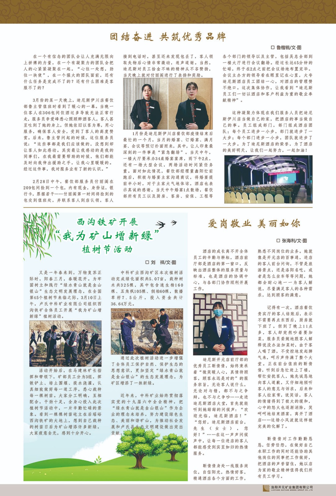 洛陽開元礦業(yè)集團有限公司簡介洛陽開元礦業(yè)集團有限公司,始成立于2006年,位于洛陽市開元大道269號。集團旗下共有五余家全資子公司,業(yè)務涉及有色金屬礦山開發(fā)、礦產品購銷與進出口貿易、房地產開發(fā)、文化藝術、企業(yè)管理與咨詢、資本投資等多個領域。民建河南省委委員、民建河南省委企業(yè)委副主任、民建洛陽市委委員、企業(yè)委主任、洛陽民建企業(yè)家協(xié)會會長許明月是公司創(chuàng)始人,現(xiàn)任洛陽開元礦業(yè)集團有限公司董事長。在礦業(yè)領域,洛陽開元礦業(yè)集團擁有多家實力雄厚的子公司:貴州開元礦業(yè)有限公司探、采礦權面積共11.33平方公里;興??h銅鑫礦業(yè)有限公司探礦權面積8.76平方公里,礦山資源潛力巨大;2021年,開元集團與盧氏中科礦業(yè)有限公司開展戰(zhàn)略合作。盧氏中科礦業(yè)有限公司專注于有色金屬的浮選、加工和銷售,擁有強大的技術支撐平臺,是集探、采、選、冶、研為一體的中大型綜合礦業(yè)企業(yè)。目前,盧氏中科王家河1000噸選礦廠已成功投產,雙河金礦、柳關欒盧鉛鋅礦相繼順利開工,樓房銀礦與圪老灣鉛鋅礦的深部探礦重大突破,標志著礦山版圖取得重大進展,為開元集團后續(xù)發(fā)展奠定了堅實基礎。在文化傳媒領域,洛陽市明月美術館通過豐富多樣的藝術展覽、學術研討和公共教育活動,努力打造一個集展覽、交流、教育、研究為一體的綜合性藝術平臺。此外,在金融投資領域,開元集團旗下的北京明峰資本管理有限公司專注于投資具有高增長潛力的優(yōu)秀企業(yè),特別是高科技、新能源、環(huán)保等新興產業(yè),為客戶提供個性化的資產配置服務。在做好企業(yè)經營的同時,開元集團始終不忘企業(yè)的社會責任和家國情懷,以突出的愛心公益事跡,開展了一系列公益慈善活動:“民建林”公益事業(yè)通過“思源基金”“幫幫公益”線上公益平臺,與眾多愛心人士籌措資金20余萬元;資助541名貧困大學生共計270余萬元,推進“數字助力——河南AI人才培養(yǎng)”;捐款10萬元,馳援京津冀、黑龍江洪水地質災害……公司于2017年底被洛陽市慈善總會評為“洛陽慈善風云榜——十大愛心集體”。洛陽開元礦業(yè)集團有限公司秉承持續(xù)發(fā)展理念,憑借多年來良好的企業(yè)信譽與經營業(yè)績,與全國多家企業(yè)建立了良好合作關系,受到社會各界的一致好評,多次榮獲“納稅標兵”“先進企業(yè)”“招商引資模范企業(yè)”等榮譽稱號。回望來時路,開元人勠力同心,以“闖”的精神和“創(chuàng)”的勁頭,一路披荊斬棘,踏過千山萬水;展望新未來,開元人凝心聚力,不執(zhí)于“舊”,無畏于“新”,秉承“勇于跨越,追求卓越”的企業(yè)精神,乘著國家高質量發(fā)展新征程的東風,跨過高山,越過大海,向著集團多元化、國際化的目標,逐夢遠航,跨越前行!