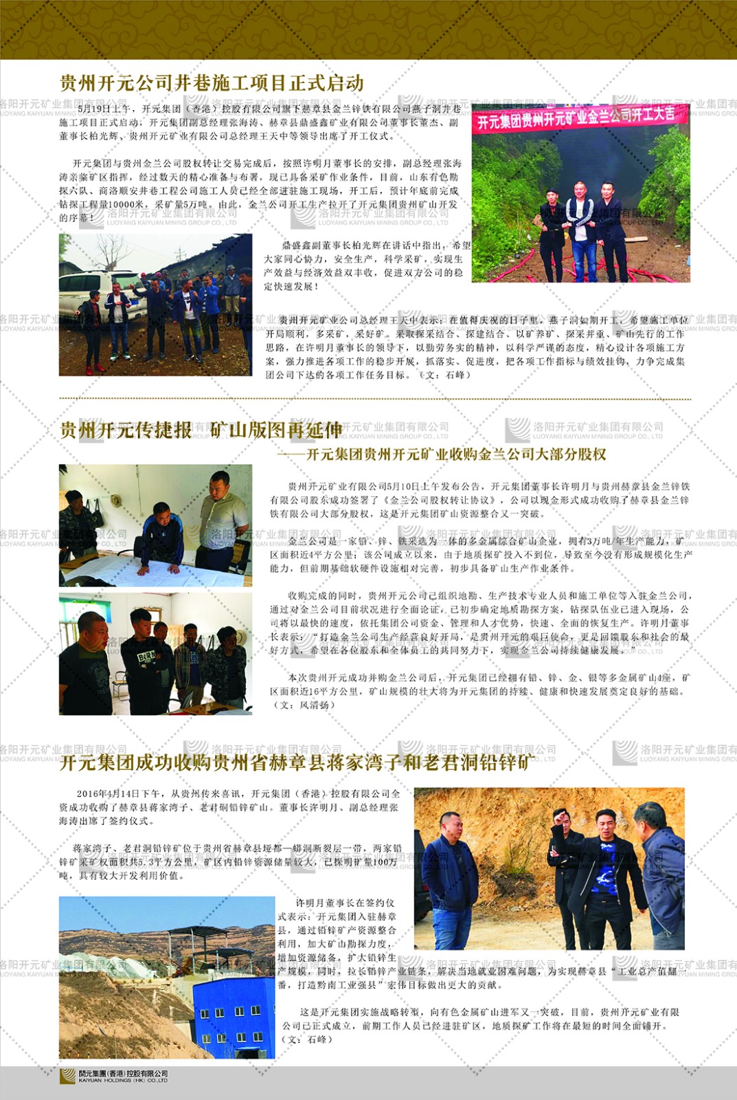 洛陽開元礦業(yè)集團有限公司簡介洛陽開元礦業(yè)集團有限公司,始成立于2006年,位于洛陽市開元大道269號。集團旗下共有五余家全資子公司,業(yè)務(wù)涉及有色金屬礦山開發(fā)、礦產(chǎn)品購銷與進出口貿(mào)易、房地產(chǎn)開發(fā)、文化藝術(shù)、企業(yè)管理與咨詢、資本投資等多個領(lǐng)域。民建河南省委委員、民建河南省委企業(yè)委副主任、民建洛陽市委委員、企業(yè)委主任、洛陽民建企業(yè)家協(xié)會會長許明月是公司創(chuàng)始人,現(xiàn)任洛陽開元礦業(yè)集團有限公司董事長。在礦業(yè)領(lǐng)域,洛陽開元礦業(yè)集團擁有多家實力雄厚的子公司:貴州開元礦業(yè)有限公司探、采礦權(quán)面積共11.33平方公里;興??h銅鑫礦業(yè)有限公司探礦權(quán)面積8.76平方公里,礦山資源潛力巨大;2021年,開元集團與盧氏中科礦業(yè)有限公司開展戰(zhàn)略合作。盧氏中科礦業(yè)有限公司專注于有色金屬的浮選、加工和銷售,擁有強大的技術(shù)支撐平臺,是集探、采、選、冶、研為一體的中大型綜合礦業(yè)企業(yè)。目前,盧氏中科王家河1000噸選礦廠已成功投產(chǎn),雙河金礦、柳關(guān)欒盧鉛鋅礦相繼順利開工,樓房銀礦與圪老灣鉛鋅礦的深部探礦重大突破,標志著礦山版圖取得重大進展,為開元集團后續(xù)發(fā)展奠定了堅實基礎(chǔ)。在文化傳媒領(lǐng)域,洛陽市明月美術(shù)館通過豐富多樣的藝術(shù)展覽、學(xué)術(shù)研討和公共教育活動,努力打造一個集展覽、交流、教育、研究為一體的綜合性藝術(shù)平臺。此外,在金融投資領(lǐng)域,開元集團旗下的北京明峰資本管理有限公司專注于投資具有高增長潛力的優(yōu)秀企業(yè),特別是高科技、新能源、環(huán)保等新興產(chǎn)業(yè),為客戶提供個性化的資產(chǎn)配置服務(wù)。在做好企業(yè)經(jīng)營的同時,開元集團始終不忘企業(yè)的社會責(zé)任和家國情懷,以突出的愛心公益事跡,開展了一系列公益慈善活動:“民建林”公益事業(yè)通過“思源基金”“幫幫公益”線上公益平臺,與眾多愛心人士籌措資金20余萬元;資助541名貧困大學(xué)生共計270余萬元,推進“數(shù)字助力——河南AI人才培養(yǎng)”;捐款10萬元,馳援京津冀、黑龍江洪水地質(zhì)災(zāi)害……公司于2017年底被洛陽市慈善總會評為“洛陽慈善風(fēng)云榜——十大愛心集體”。洛陽開元礦業(yè)集團有限公司秉承持續(xù)發(fā)展理念,憑借多年來良好的企業(yè)信譽與經(jīng)營業(yè)績,與全國多家企業(yè)建立了良好合作關(guān)系,受到社會各界的一致好評,多次榮獲“納稅標兵”“先進企業(yè)”“招商引資模范企業(yè)”等榮譽稱號。回望來時路,開元人勠力同心,以“闖”的精神和“創(chuàng)”的勁頭,一路披荊斬棘,踏過千山萬水;展望新未來,開元人凝心聚力,不執(zhí)于“舊”,無畏于“新”,秉承“勇于跨越,追求卓越”的企業(yè)精神,乘著國家高質(zhì)量發(fā)展新征程的東風(fēng),跨過高山,越過大海,向著集團多元化、國際化的目標,逐夢遠航,跨越前行!