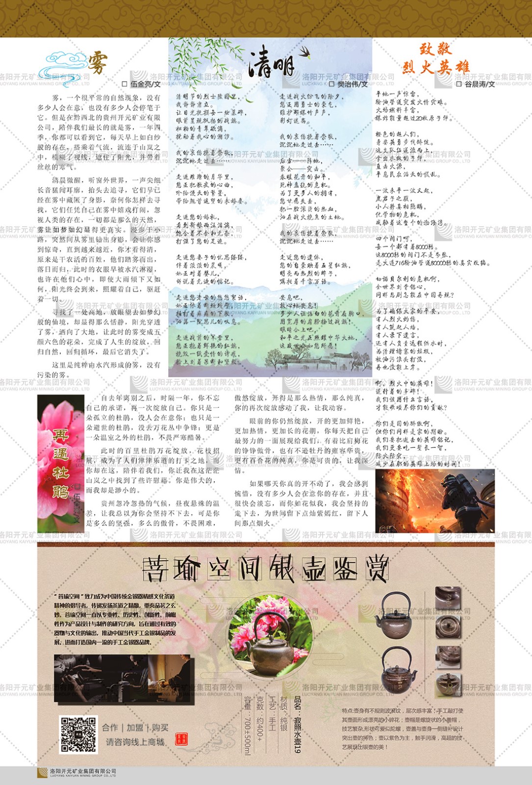洛陽開元礦業(yè)集團(tuán)有限公司簡介洛陽開元礦業(yè)集團(tuán)有限公司,始成立于2006年,位于洛陽市開元大道269號(hào)。集團(tuán)旗下共有五余家全資子公司,業(yè)務(wù)涉及有色金屬礦山開發(fā)、礦產(chǎn)品購銷與進(jìn)出口貿(mào)易、房地產(chǎn)開發(fā)、文化藝術(shù)、企業(yè)管理與咨詢、資本投資等多個(gè)領(lǐng)域。民建河南省委委員、民建河南省委企業(yè)委副主任、民建洛陽市委委員、企業(yè)委主任、洛陽民建企業(yè)家協(xié)會(huì)會(huì)長許明月是公司創(chuàng)始人,現(xiàn)任洛陽開元礦業(yè)集團(tuán)有限公司董事長。在礦業(yè)領(lǐng)域,洛陽開元礦業(yè)集團(tuán)擁有多家實(shí)力雄厚的子公司:貴州開元礦業(yè)有限公司探、采礦權(quán)面積共11.33平方公里;興??h銅鑫礦業(yè)有限公司探礦權(quán)面積8.76平方公里,礦山資源潛力巨大;2021年,開元集團(tuán)與盧氏中科礦業(yè)有限公司開展戰(zhàn)略合作。盧氏中科礦業(yè)有限公司專注于有色金屬的浮選、加工和銷售,擁有強(qiáng)大的技術(shù)支撐平臺(tái),是集探、采、選、冶、研為一體的中大型綜合礦業(yè)企業(yè)。目前,盧氏中科王家河1000噸選礦廠已成功投產(chǎn),雙河金礦、柳關(guān)欒盧鉛鋅礦相繼順利開工,樓房銀礦與圪老灣鉛鋅礦的深部探礦重大突破,標(biāo)志著礦山版圖取得重大進(jìn)展,為開元集團(tuán)后續(xù)發(fā)展奠定了堅(jiān)實(shí)基礎(chǔ)。在文化傳媒領(lǐng)域,洛陽市明月美術(shù)館通過豐富多樣的藝術(shù)展覽、學(xué)術(shù)研討和公共教育活動(dòng),努力打造一個(gè)集展覽、交流、教育、研究為一體的綜合性藝術(shù)平臺(tái)。此外,在金融投資領(lǐng)域,開元集團(tuán)旗下的北京明峰資本管理有限公司專注于投資具有高增長潛力的優(yōu)秀企業(yè),特別是高科技、新能源、環(huán)保等新興產(chǎn)業(yè),為客戶提供個(gè)性化的資產(chǎn)配置服務(wù)。在做好企業(yè)經(jīng)營的同時(shí),開元集團(tuán)始終不忘企業(yè)的社會(huì)責(zé)任和家國情懷,以突出的愛心公益事跡,開展了一系列公益慈善活動(dòng):“民建林”公益事業(yè)通過“思源基金”“幫幫公益”線上公益平臺(tái),與眾多愛心人士籌措資金20余萬元;資助541名貧困大學(xué)生共計(jì)270余萬元,推進(jìn)“數(shù)字助力——河南AI人才培養(yǎng)”;捐款10萬元,馳援京津冀、黑龍江洪水地質(zhì)災(zāi)害……公司于2017年底被洛陽市慈善總會(huì)評(píng)為“洛陽慈善風(fēng)云榜——十大愛心集體”。洛陽開元礦業(yè)集團(tuán)有限公司秉承持續(xù)發(fā)展理念,憑借多年來良好的企業(yè)信譽(yù)與經(jīng)營業(yè)績,與全國多家企業(yè)建立了良好合作關(guān)系,受到社會(huì)各界的一致好評(píng),多次榮獲“納稅標(biāo)兵”“先進(jìn)企業(yè)”“招商引資模范企業(yè)”等榮譽(yù)稱號(hào)?;赝麃頃r(shí)路,開元人勠力同心,以“闖”的精神和“創(chuàng)”的勁頭,一路披荊斬棘,踏過千山萬水;展望新未來,開元人凝心聚力,不執(zhí)于“舊”,無畏于“新”,秉承“勇于跨越,追求卓越”的企業(yè)精神,乘著國家高質(zhì)量發(fā)展新征程的東風(fēng),跨過高山,越過大海,向著集團(tuán)多元化、國際化的目標(biāo),逐夢(mèng)遠(yuǎn)航,跨越前行!