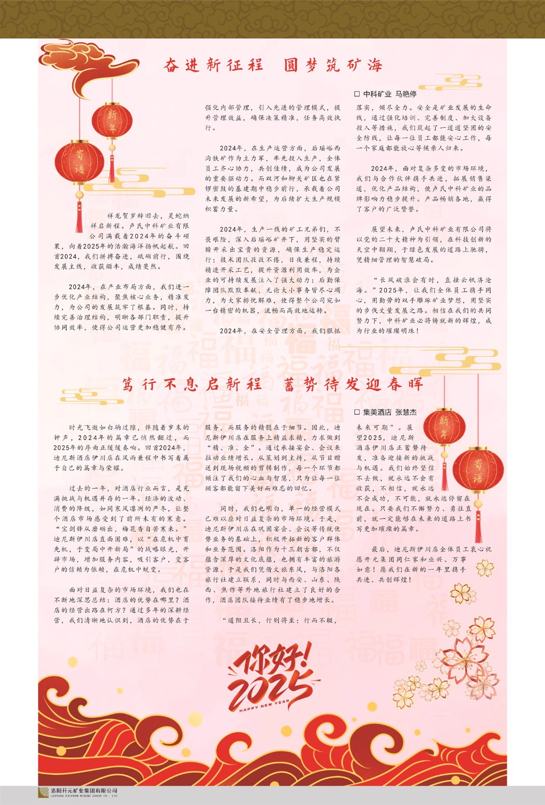 洛陽開元礦業(yè)集團(tuán)有限公司簡介洛陽開元礦業(yè)集團(tuán)有限公司,始成立于2006年,位于洛陽市開元大道269號。集團(tuán)旗下共有五余家全資子公司,業(yè)務(wù)涉及有色金屬礦山開發(fā)、礦產(chǎn)品購銷與進(jìn)出口貿(mào)易、房地產(chǎn)開發(fā)、文化藝術(shù)、企業(yè)管理與咨詢、資本投資等多個領(lǐng)域。民建河南省委委員、民建河南省委企業(yè)委副主任、民建洛陽市委委員、企業(yè)委主任、洛陽民建企業(yè)家協(xié)會會長許明月是公司創(chuàng)始人,現(xiàn)任洛陽開元礦業(yè)集團(tuán)有限公司董事長。在礦業(yè)領(lǐng)域,洛陽開元礦業(yè)集團(tuán)擁有多家實力雄厚的子公司:貴州開元礦業(yè)有限公司探、采礦權(quán)面積共11.33平方公里;興海縣銅鑫礦業(yè)有限公司探礦權(quán)面積8.76平方公里,礦山資源潛力巨大;2021年,開元集團(tuán)與盧氏中科礦業(yè)有限公司開展戰(zhàn)略合作。盧氏中科礦業(yè)有限公司專注于有色金屬的浮選、加工和銷售,擁有強(qiáng)大的技術(shù)支撐平臺,是集探、采、選、冶、研為一體的中大型綜合礦業(yè)企業(yè)。目前,盧氏中科王家河1000噸選礦廠已成功投產(chǎn),雙河金礦、柳關(guān)欒盧鉛鋅礦相繼順利開工,樓房銀礦與圪老灣鉛鋅礦的深部探礦重大突破,標(biāo)志著礦山版圖取得重大進(jìn)展,為開元集團(tuán)后續(xù)發(fā)展奠定了堅實基礎(chǔ)。在文化傳媒領(lǐng)域,洛陽市明月美術(shù)館通過豐富多樣的藝術(shù)展覽、學(xué)術(shù)研討和公共教育活動,努力打造一個集展覽、交流、教育、研究為一體的綜合性藝術(shù)平臺。此外,在金融投資領(lǐng)域,開元集團(tuán)旗下的北京明峰資本管理有限公司專注于投資具有高增長潛力的優(yōu)秀企業(yè),特別是高科技、新能源、環(huán)保等新興產(chǎn)業(yè),為客戶提供個性化的資產(chǎn)配置服務(wù)。在做好企業(yè)經(jīng)營的同時,開元集團(tuán)始終不忘企業(yè)的社會責(zé)任和家國情懷,以突出的愛心公益事跡,開展了一系列公益慈善活動:“民建林”公益事業(yè)通過“思源基金”“幫幫公益”線上公益平臺,與眾多愛心人士籌措資金20余萬元;資助541名貧困大學(xué)生共計270余萬元,推進(jìn)“數(shù)字助力——河南AI人才培養(yǎng)”;捐款10萬元,馳援京津冀、黑龍江洪水地質(zhì)災(zāi)害……公司于2017年底被洛陽市慈善總會評為“洛陽慈善風(fēng)云榜——十大愛心集體”。洛陽開元礦業(yè)集團(tuán)有限公司秉承持續(xù)發(fā)展理念,憑借多年來良好的企業(yè)信譽與經(jīng)營業(yè)績,與全國多家企業(yè)建立了良好合作關(guān)系,受到社會各界的一致好評,多次榮獲“納稅標(biāo)兵”“先進(jìn)企業(yè)”“招商引資模范企業(yè)”等榮譽稱號?;赝麃頃r路,開元人勠力同心,以“闖”的精神和“創(chuàng)”的勁頭,一路披荊斬棘,踏過千山萬水;展望新未來,開元人凝心聚力,不執(zhí)于“舊”,無畏于“新”,秉承“勇于跨越,追求卓越”的企業(yè)精神,乘著國家高質(zhì)量發(fā)展新征程的東風(fēng),跨過高山,越過大海,向著集團(tuán)多元化、國際化的目標(biāo),逐夢遠(yuǎn)航,跨越前行!